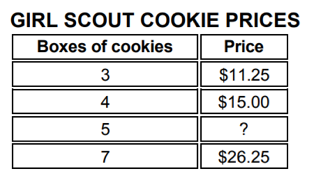 The table shows the cost of Girl Scout cookies. In order to continue the proportional relationship, how much would 5 boxes of cookies cost?