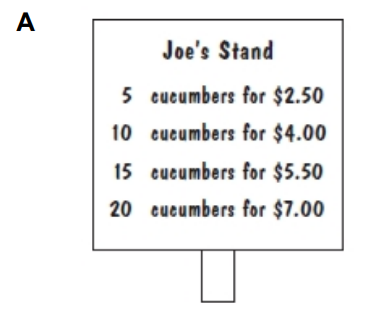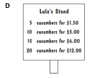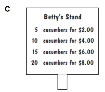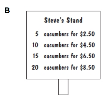 Jocelyn was shopping at a farmers’ market. She observed the prices of cucumbers at several stands. Which sign shows a proportional relationship in the pricing of the cucumbers?