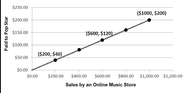 When a song is sold by an online music store, the store takes some of the money and the singer gets the rest. The graph below shows how much money a pop singer makes given the total amount of money brought in by one popular online music store from sales of the song.