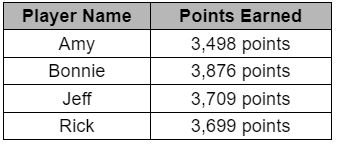 Use the information in the table below to order the number of points each player earned from least to greatest.