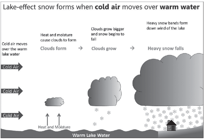 4. Lake-effect snow forms when cold air passes over the warmer waters of a lake. Water holds on to heat more than air. As a result, below freezing air often passes over much warmer water. This causes some lake water to evaporate into the air and warm it. This warmer, wetter air rises and cools as it moves away from the lake. When it cools, it dumps all that moisture on the ground. If it’s cold enough, that moisture becomes snow.