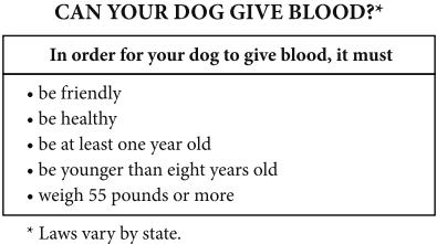 3 Like humans, not every dog is eligible to donate blood. The pooches are screened for health first. Dogs must have the correct blood type, weigh at least 55 pounds and be younger than 8 years old. About 150 dogs participate in the program. Each donates three or four pints a year, which can help animals suffering from illnesses like cancer or an accidental trauma like being hit by a car. One pint can save up to three dogs.