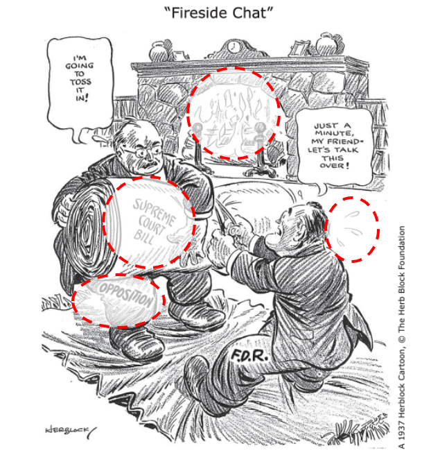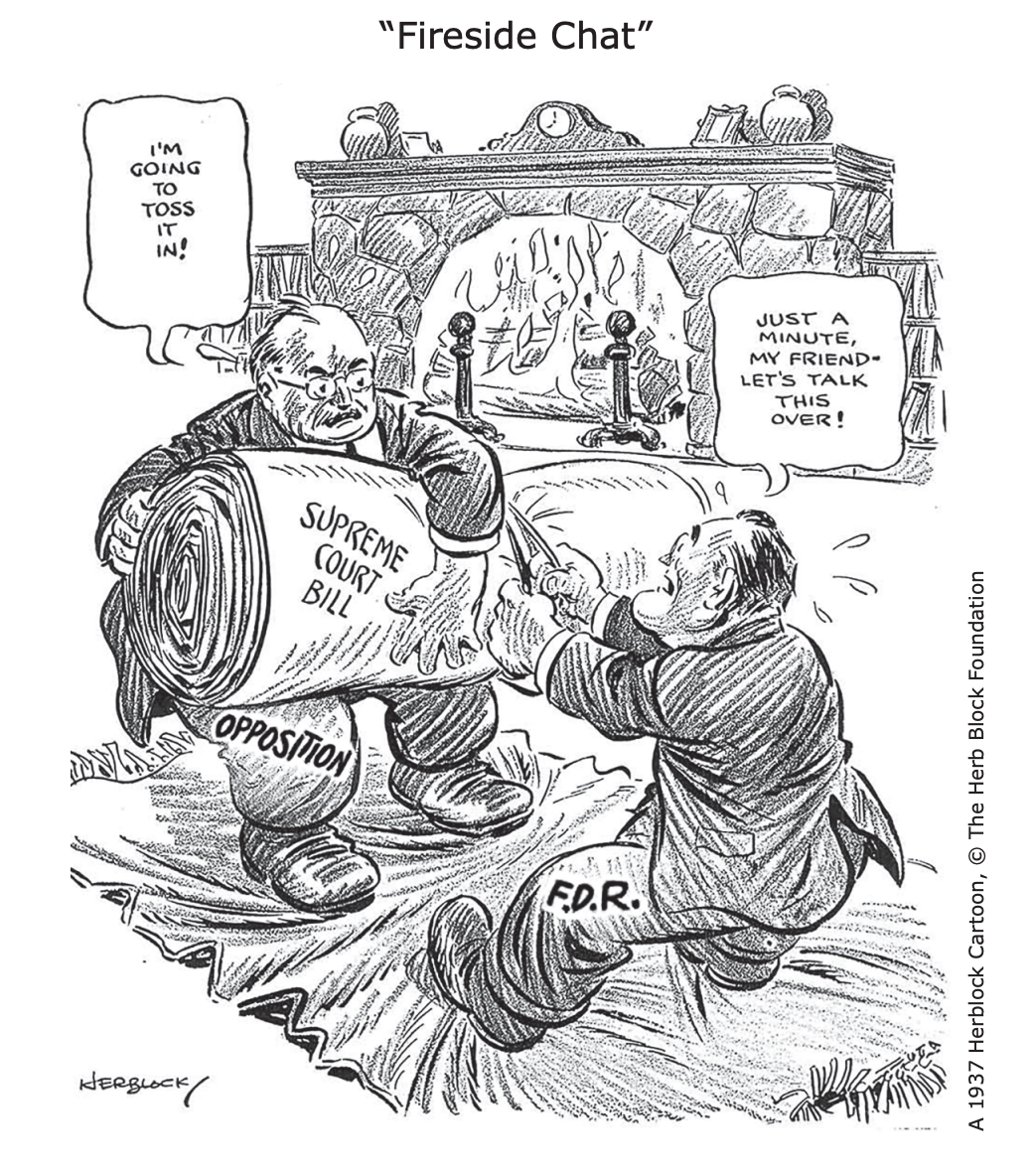 This political cartoon conveys a bill that was important to President Franklin D. Roosevelt. He wanted to weaken the power of the judicial branch over the executive, but not everyone agreed with his tactics.