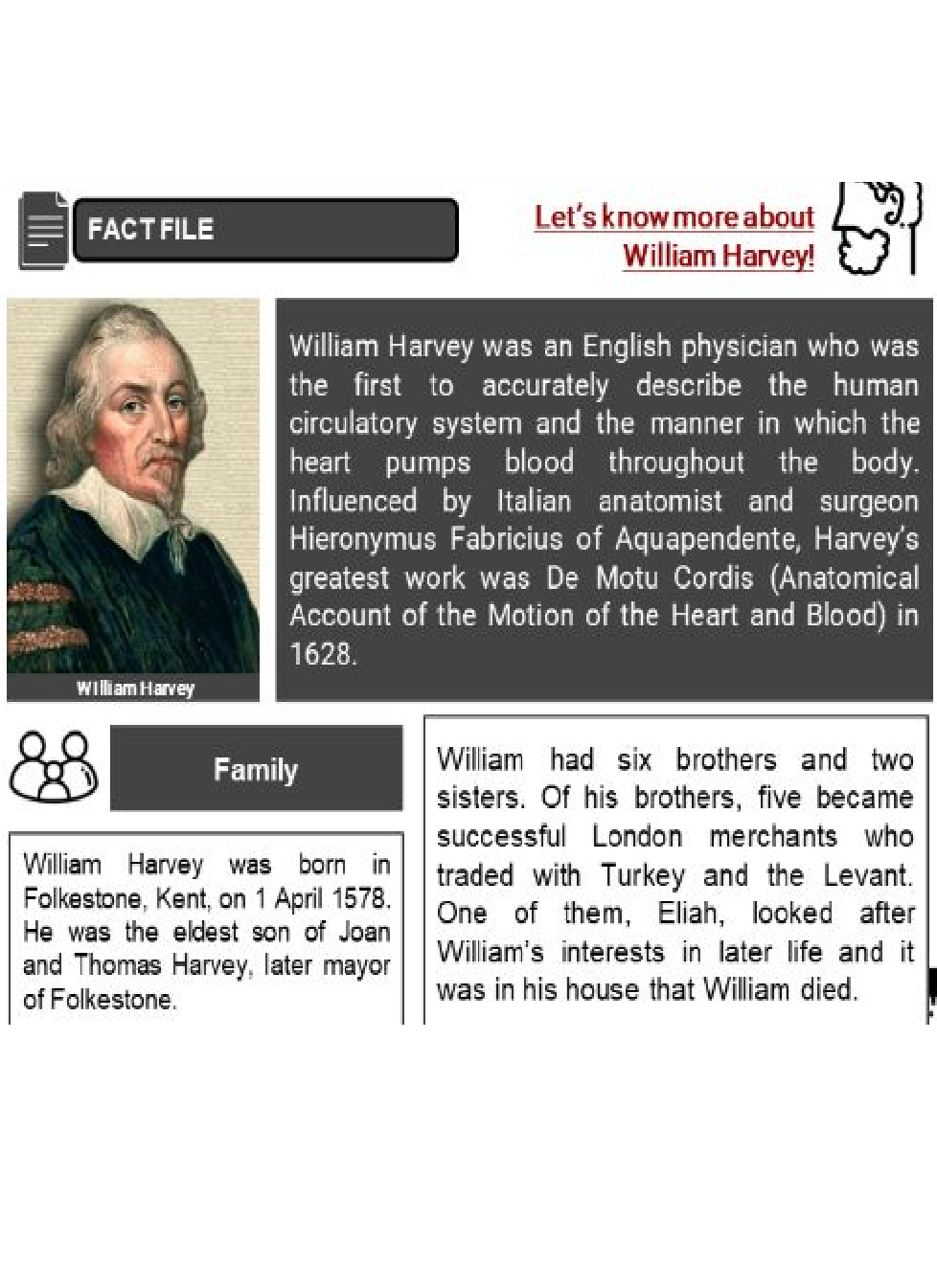 - In 1628, Harvey’s greatest work, Anatomical Account of the Motion of the Heart and Blood (De Motu Cordis) was published in Frankfurt. In this work, he explained with exemplary clarity his observations of the movement of the heart and blood, his theory of blood circulation, and his experimental proofs of the validity of his theory.