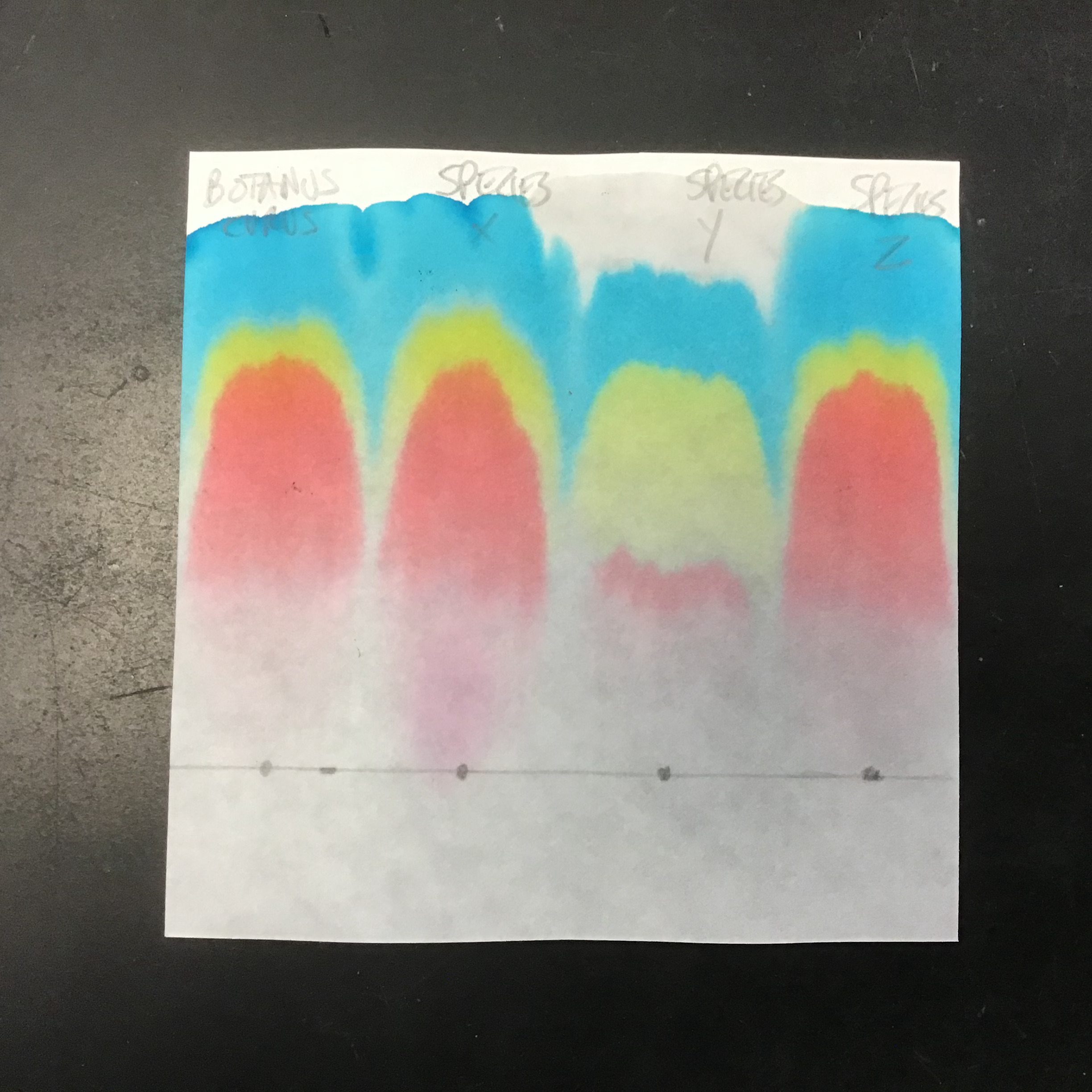 According to the paper chromatography results, which species may be more closely related to Botana curus?