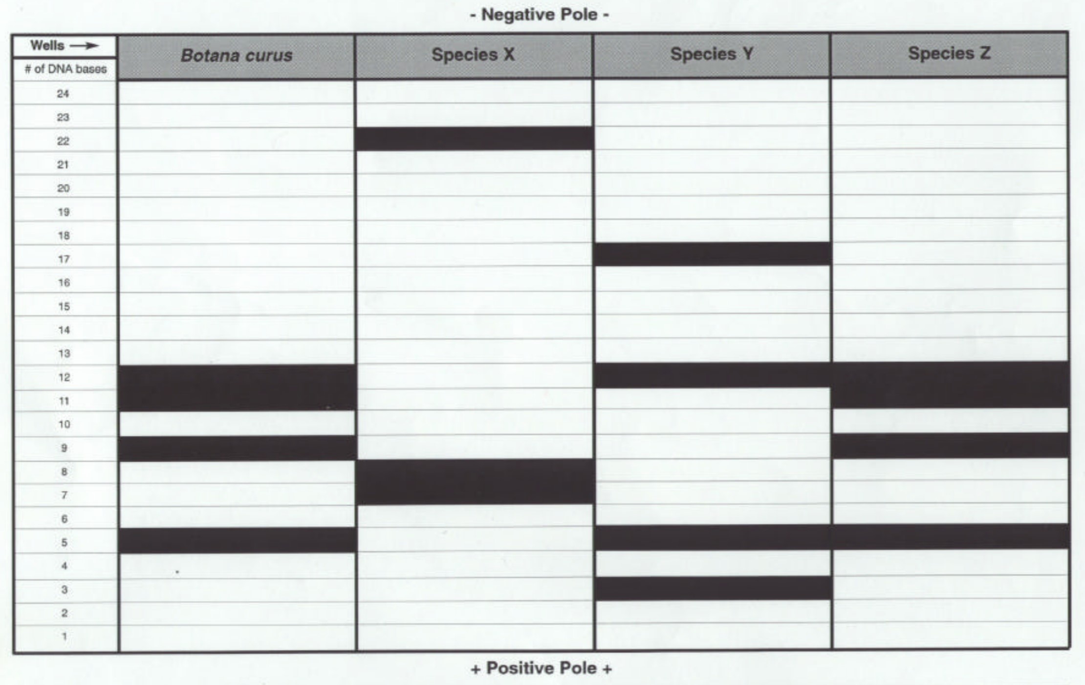 Cite specific evidence from the gel electrophoresis results that back up your claim about which species has the most similar DNA profile to Botana curus.