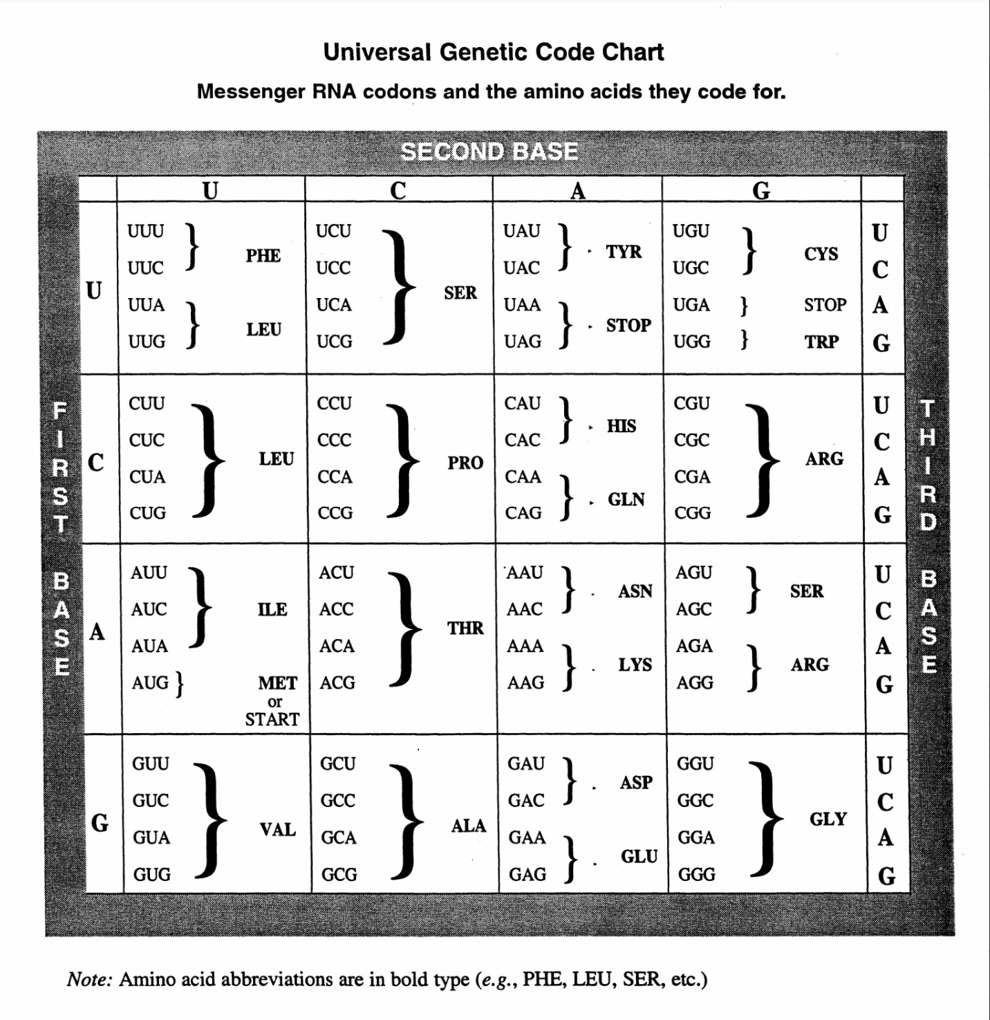 Now change the mRNA sequence for Species Z and determine the amino acid sequence that is coded for each mRNA codon. You will need the chart above. Note: the mRNA is on the right and the amino acid abbreviation that you need to manipulate is on the left.