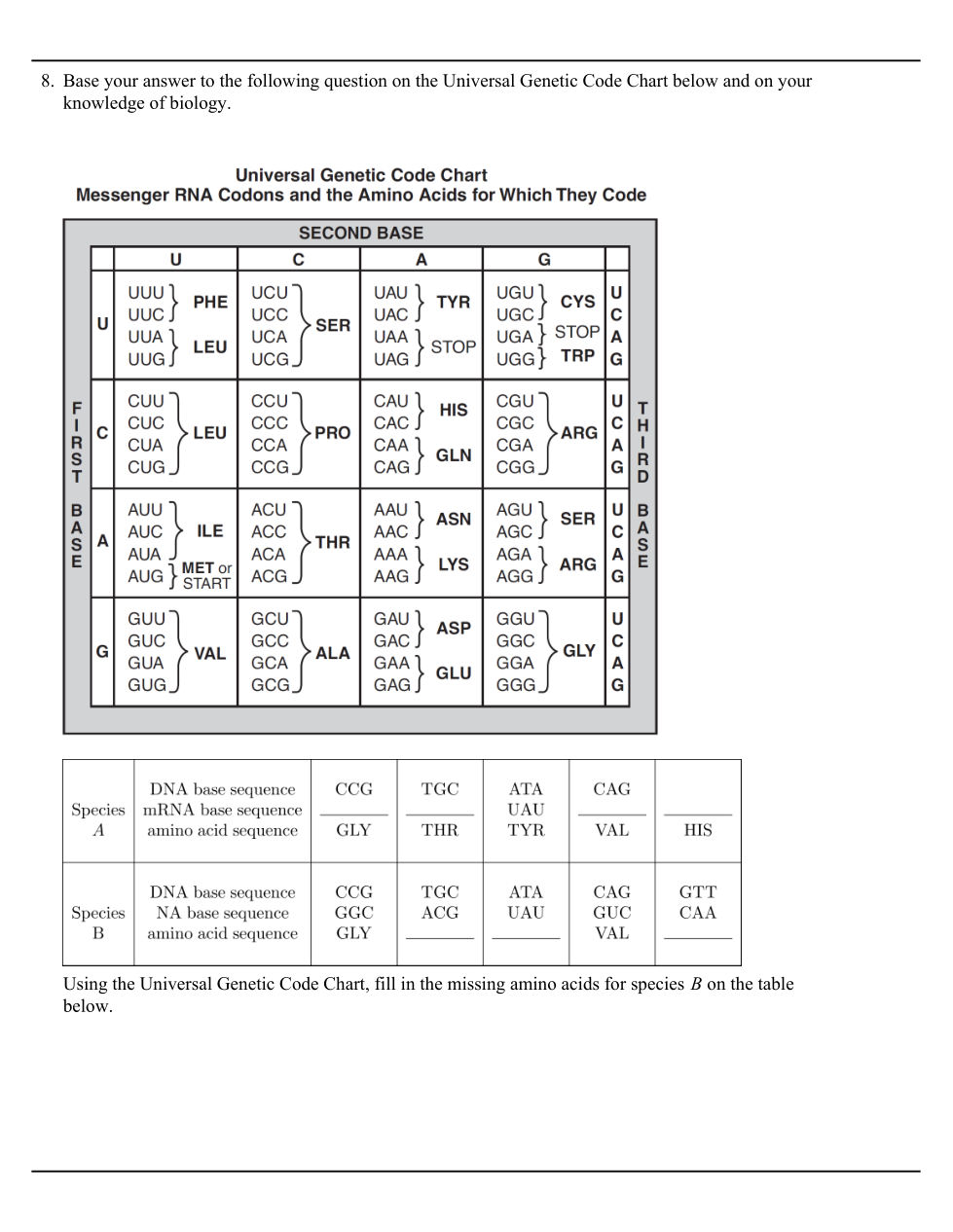 Now change the mRNA sequence for Species Y and determine the amino acid sequence that is coded for each mRNA codon. You will need the chart above. Note: the mRNA is on the right and the amino acid abbreviation that you need to manipulate is on the left.