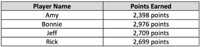 Use the information in the table below to order the number of points each player earned from least to greatest.