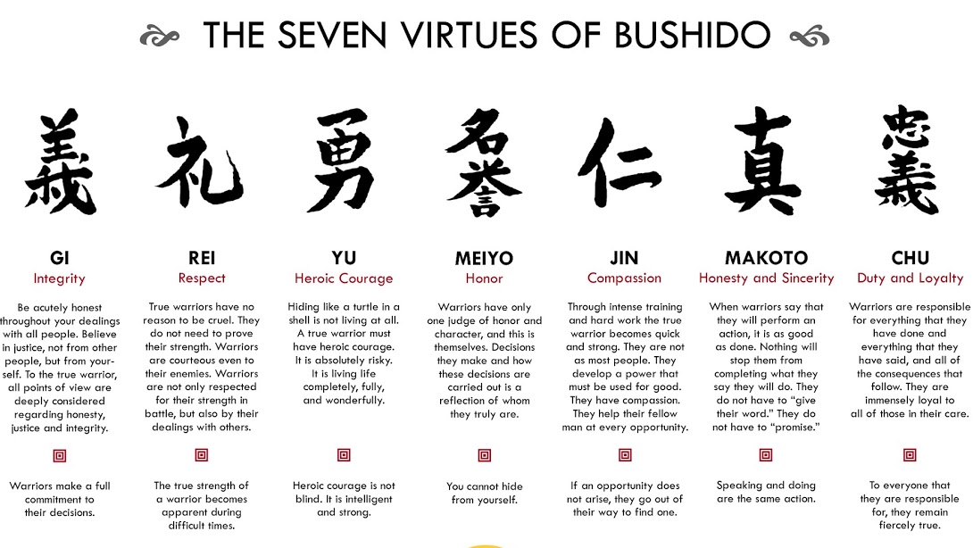 Use Canva to create a post or draw on a blank paper.Read through and use the above ‘Principles of Bushido’ to pick your principle.☐ Create a central focus around one principle of Bushido.☐ Title the One Pager appropriately to reflect the content.☐ Include your name and period somewhere in the post.☐ Explain what the principle means to the Samurai.☐ Explain what the principle means to you and how you could use it in your life.☐ Use plenty of colors, photos, and shapes in your one pager.☐ Fill the entire page [No lazy white spots!].Rubric (How you will be graded.)4 - Created a one pager on a principle of Bushido, explain what the principle means to the Samurai, explain what the principle means to you, title appropriately, and have plenty of colors, photos, and shapes.3 - Created a one pager with at least four of the required elements.2 - Created a one pager with at least two of the required elements.1 - Created a one pager with at least one of the required elements.0 - I did not attempt to create a one pager on a principle of Bushido.