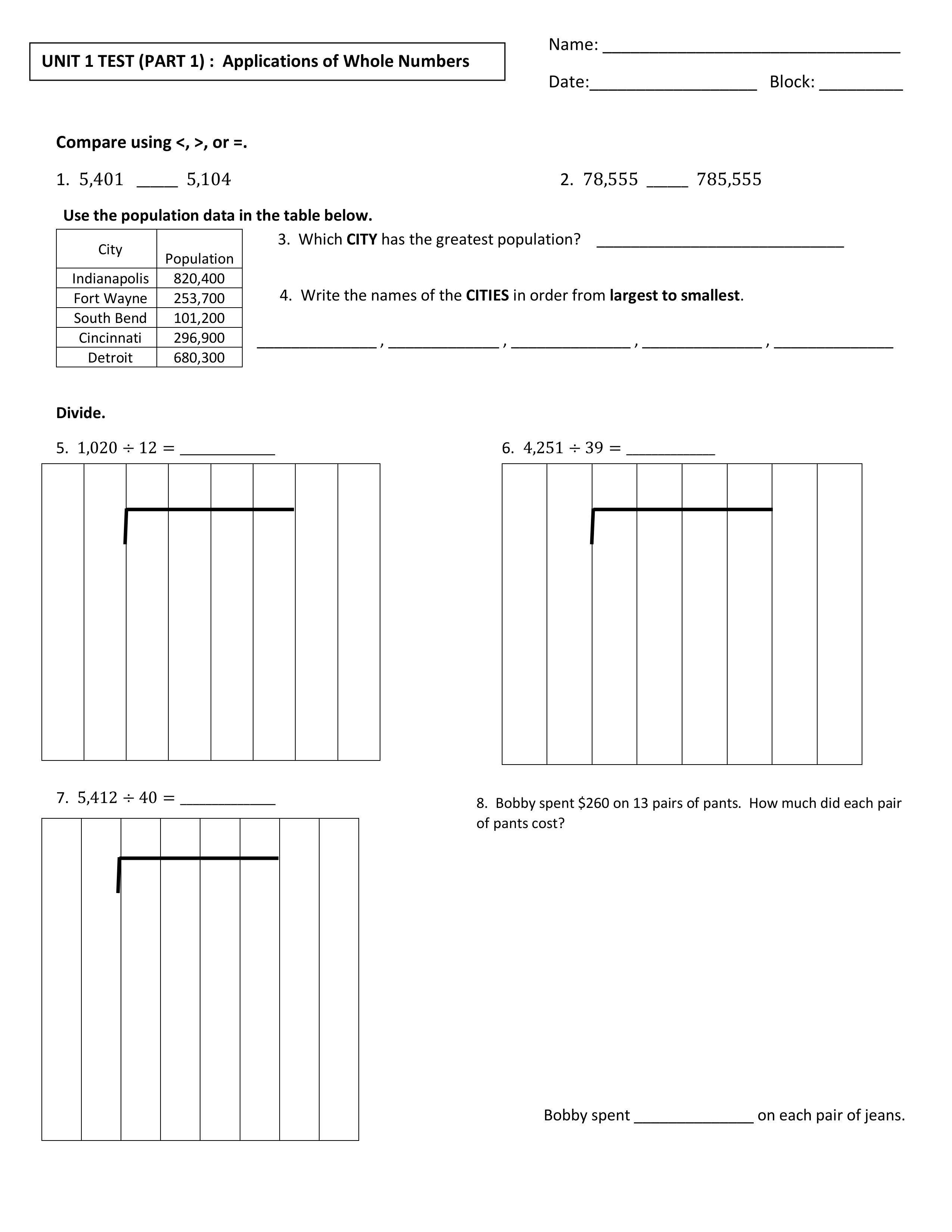Unit 1 (Part 1) Test - Applications for Whole Numbers (20-21 Older Version) cloned 7/20/2022