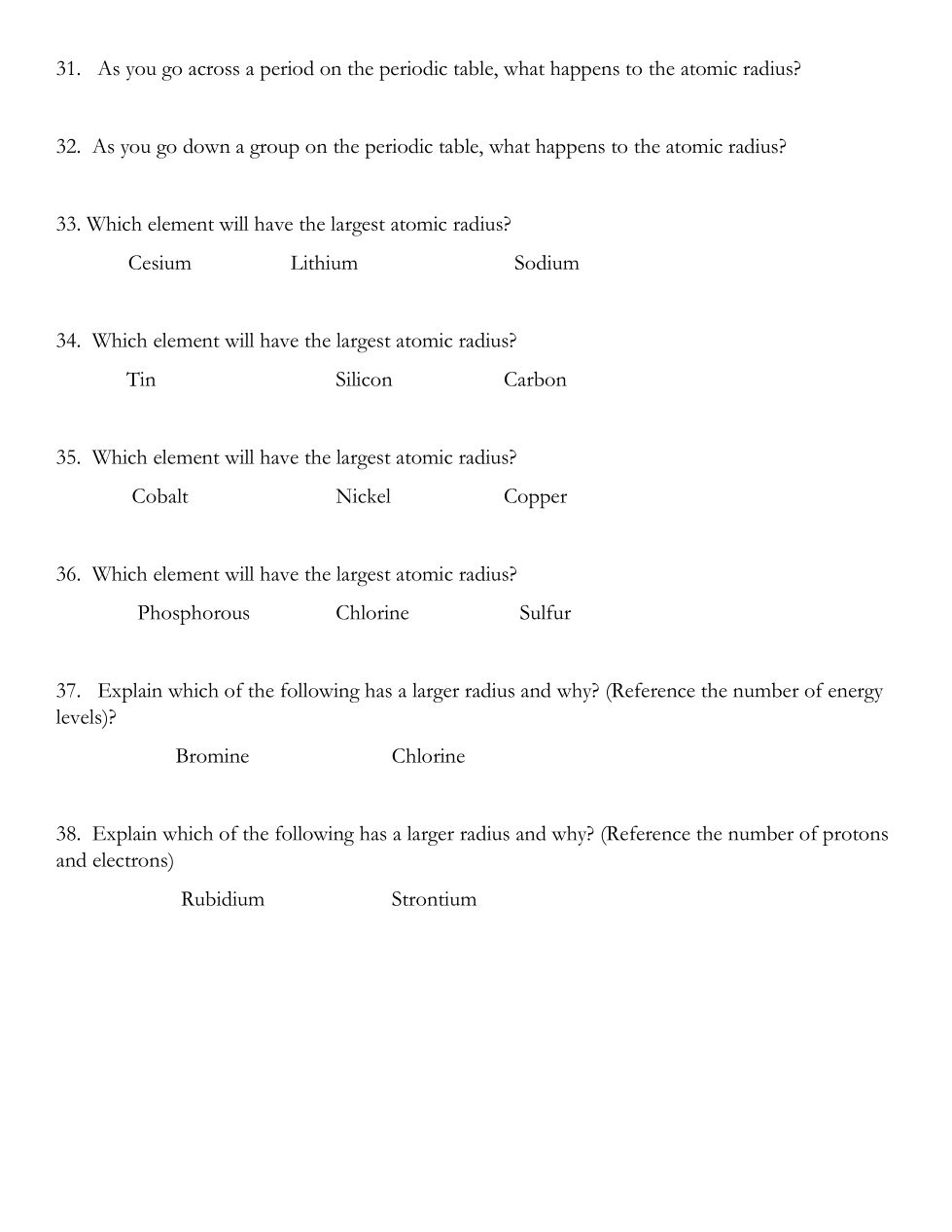 Based on answers 17-25, what happens to the radius as you move across a period?