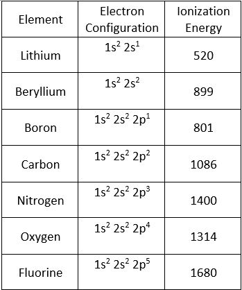 We can see a trend when we look at the ionization energies for the elements in period 2. Look at the table below which shows the ionization energy for element in period 2.