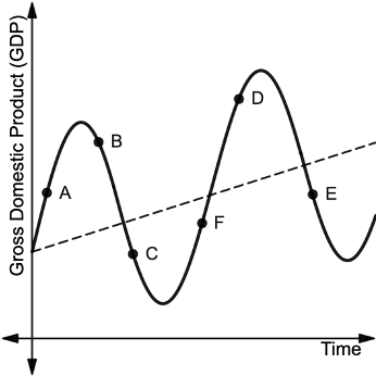 At Point E, are the slopes increasing or decreasing? What does this tell you about how GDP is changing at this part of the business cycle?