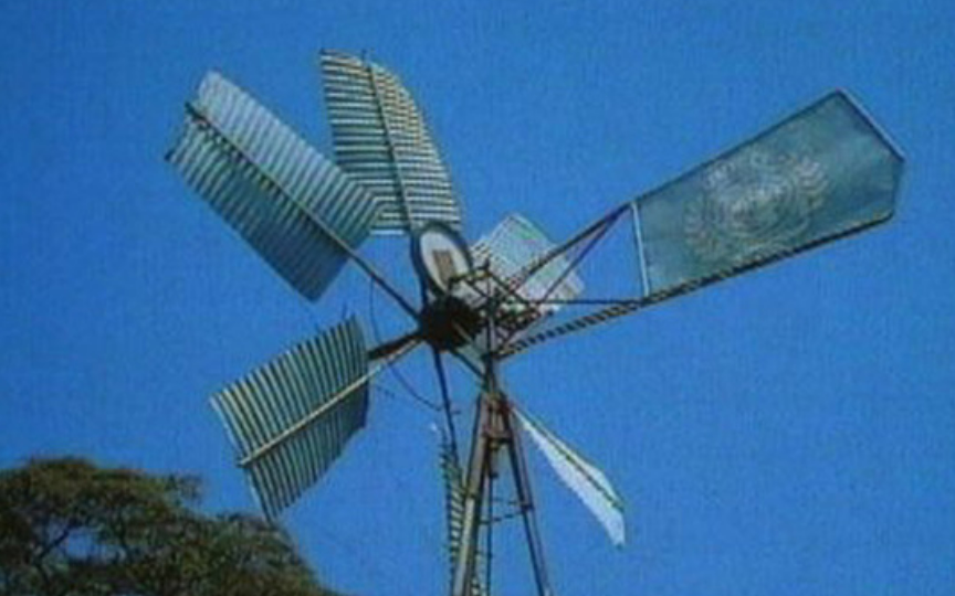 The kinetic energy of the _______ turns the blades of this windmill. The blades moving possess kinetic energy. The work done on the windmill by the wind is equal to the windmill's change in kinetic energy.