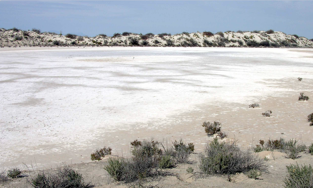A _______ is a temporary shallow lake formed after rain storms. _______ is left behind when the water from the lake evaporates.