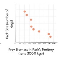 Using this graph, explain what relationship, if any, you see between prey biomass and pack size?