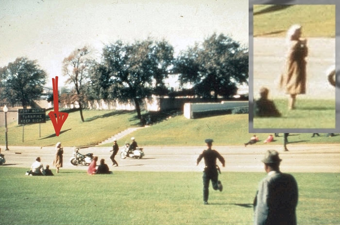 (2) She was seen standing at the grassy knoll in between Main Street and Elm Street and photographing the passing motorcade of the President while he got shot.