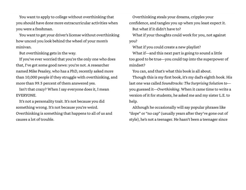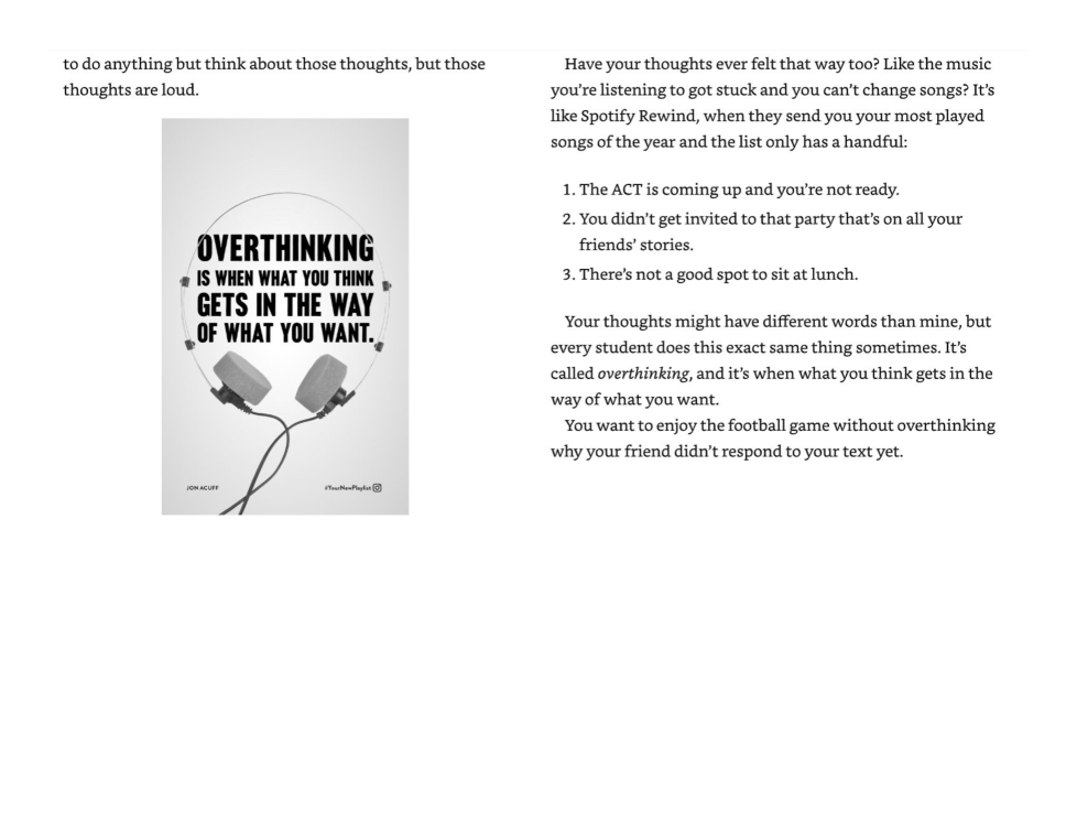 The word playlist has multiple meanings. What does the word playlist most likely suggest about thinking or overthinking? Select two options.
