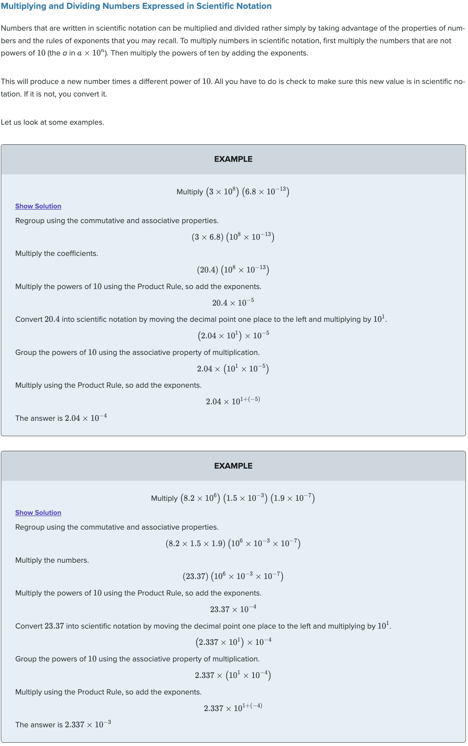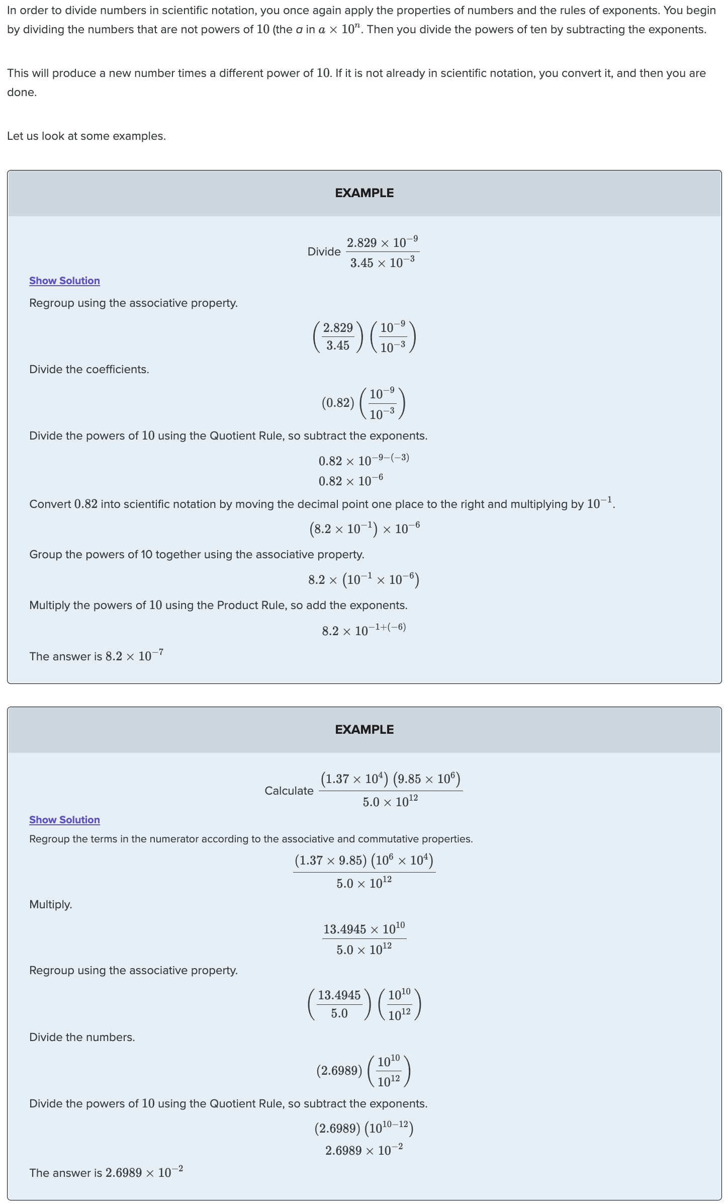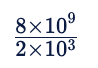 Remember to divide the factors and subtract the exponents. If the factor in your answer is less than one digit, move the decimal point to the right and decrease the exponent.
