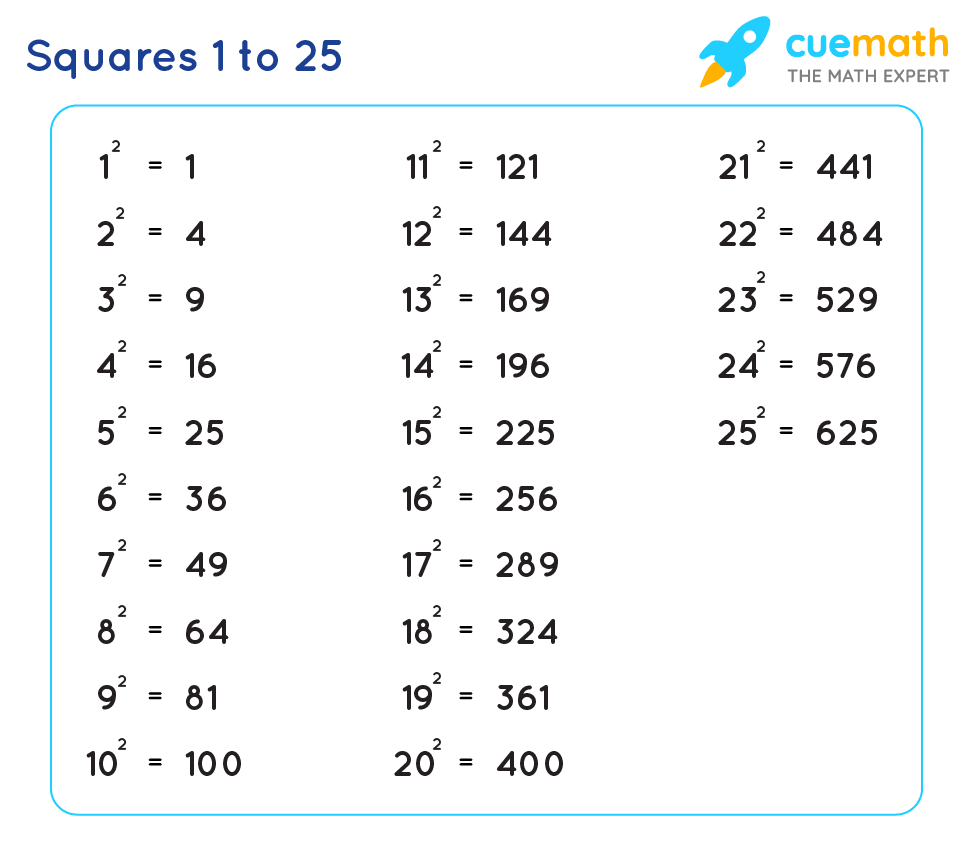 List of the first 25 perfect squares.