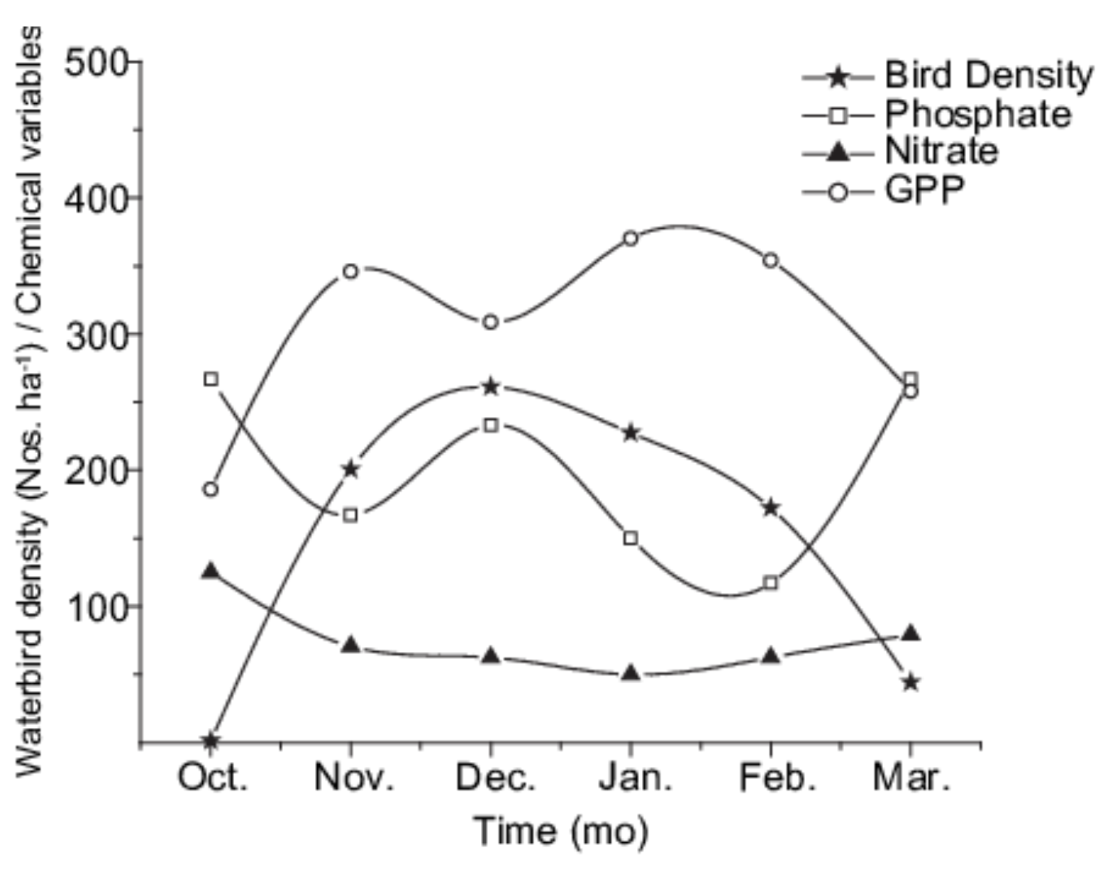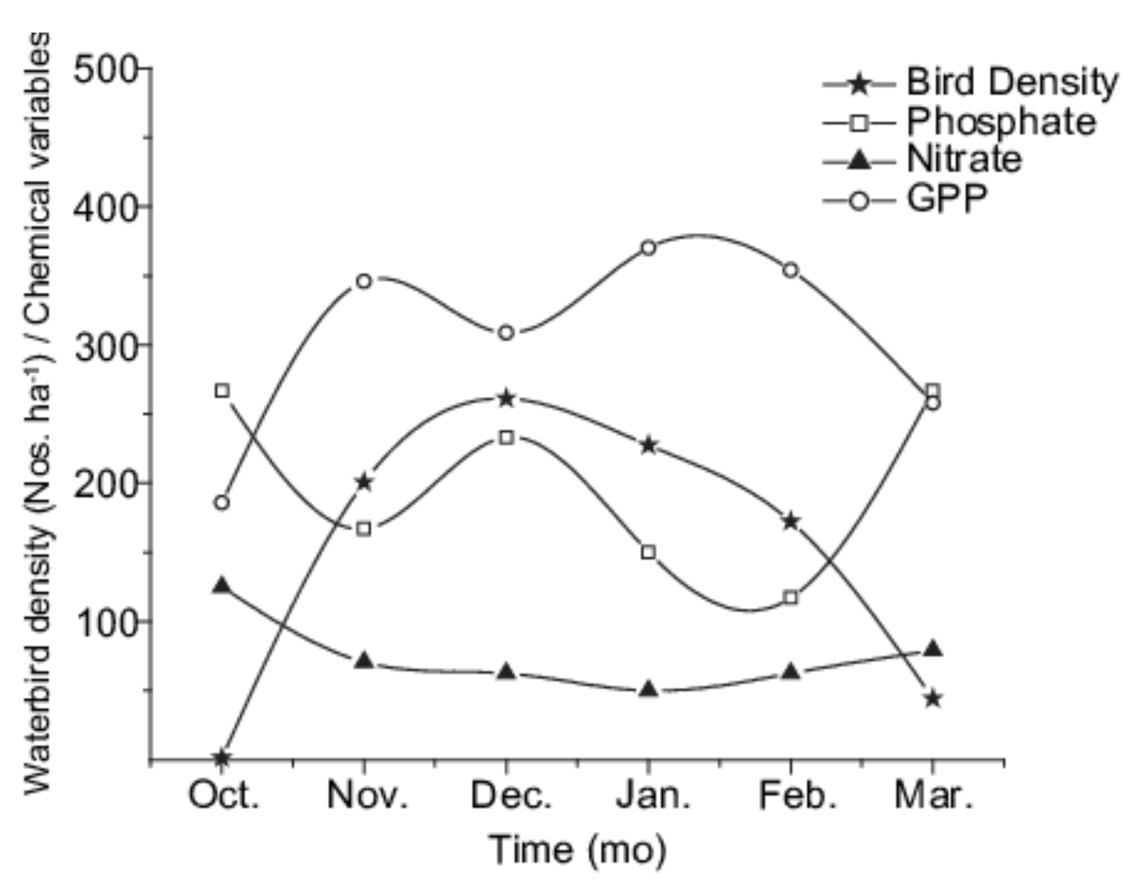 area. Abiotic factors examined were water temperature, nitrates, phosphates, and dissolved oxygen. Waterbirds are herbivores (largely feed on vegetation matter).