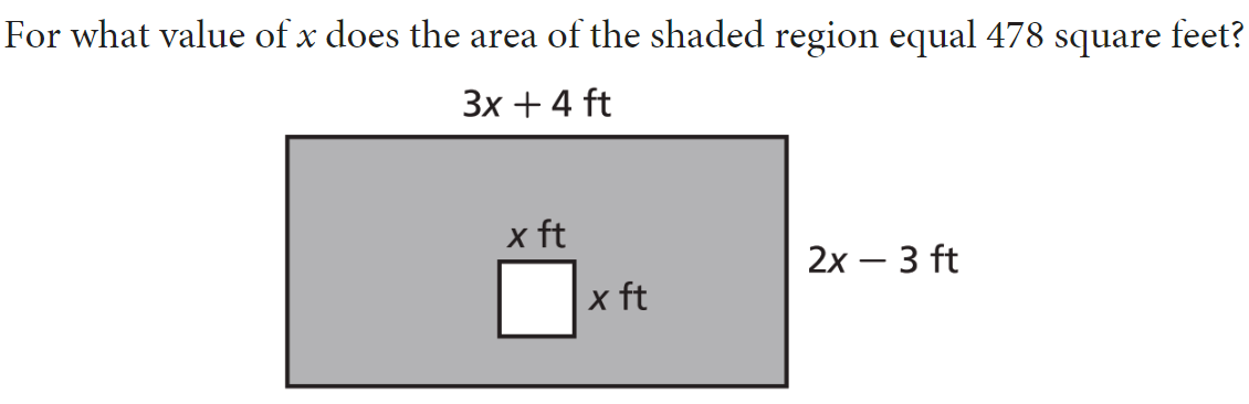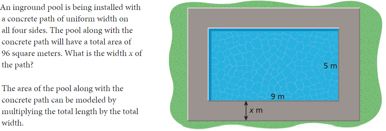 Knowing that the total area needs to equal 96 square meters, write an equation that would allow us to solve for the unknown dimension of the concrete path. Then solve the equation using factoring.