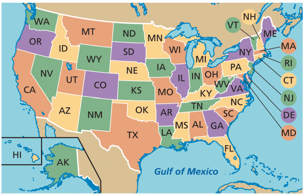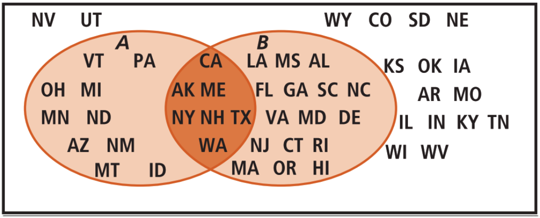 Martina is learning about the 50 states of the United States. To help her learn their locations, she created the Venn diagram shown at the right, using the postal codes of the states. Set A includes states that border Canada or Mexico, and set B includes the states that border an ocean or the Gulf of Mexico. Note that Pennsylvania and Ohio share a water border with Canada, but Wisconsin does not.