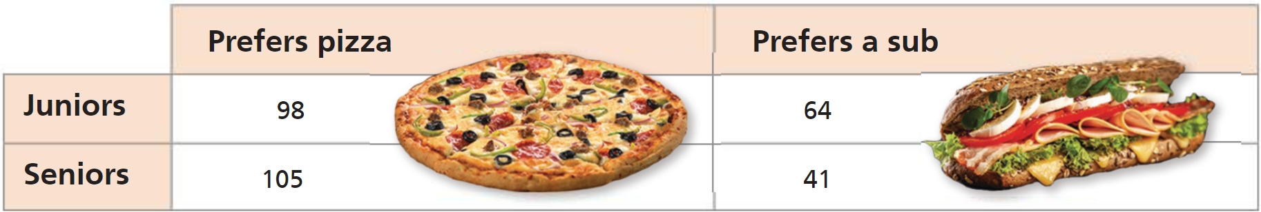 The cafeteria recently offered pizza or a sub for lunch. The upperclassmen were asked which they preferred. The results of the survey are shown in the two-way frequency table. Use the table for Problems 8-10.