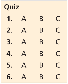 For Problems 1–6, use the following situation. A teacher gives students a multiple-choice quiz with 6 questions. Each question has 3 choices: A, B, and C.