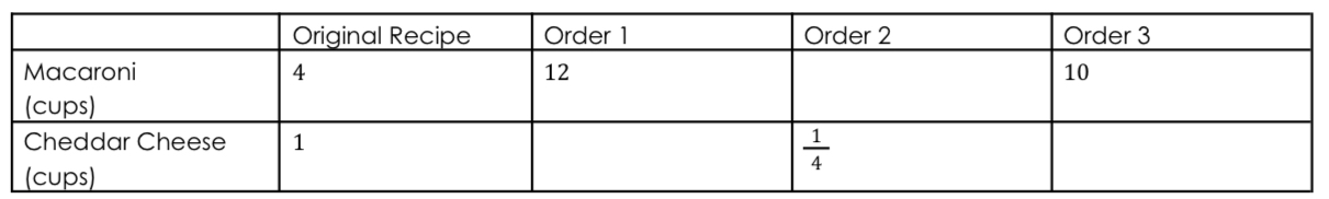 Mac—Mr. Espinoza needs to know how much of each ingredient to use in three different orders of his famous Mac ‘n’ Cheese. Help him out by completing the table below: