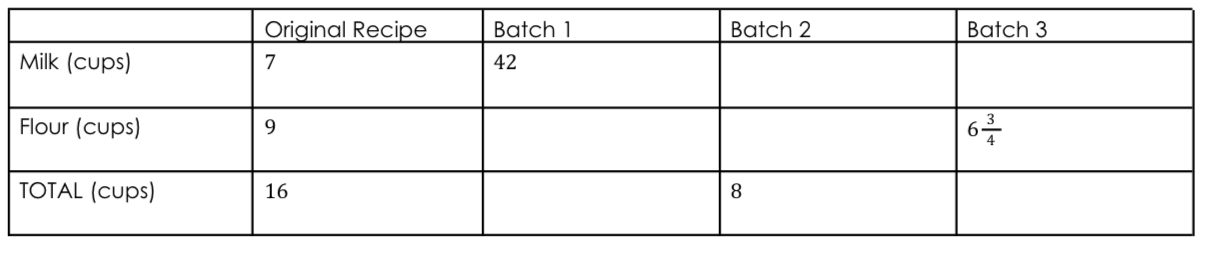 Cookies—Mr. Vasquez wants to bake cookies for the other 8th grade teachers. Complete the table to see how he will have to change his ingredients for each batch size.