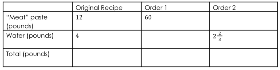 Mr. Espinoza makes two different orders of Chicken McNuggets. Complete the table to find how much of each ingredient is used.