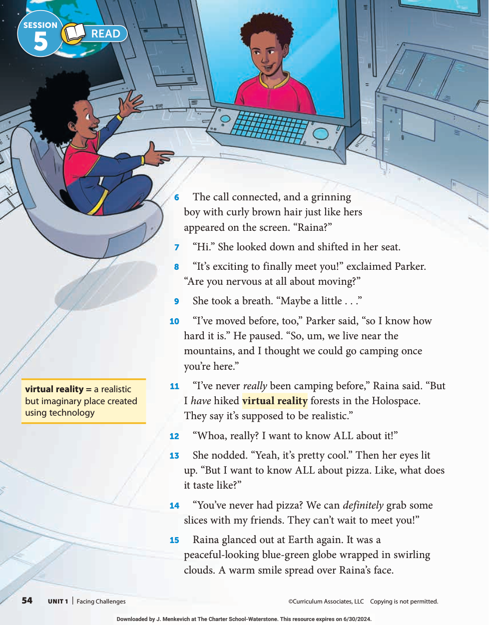 Read the sentence from paragraph 5. Outside her window, earth appeared so cold and distant.What does the phrase cold and distant tell the reader about how Raina feels about Earth?