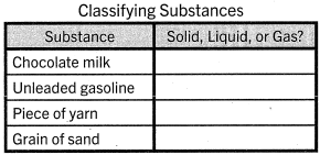 A student makes a table to classify substances as solids, liquids, or gases. The student's table is shown below.