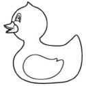 A rubber duck floats in the water of a bathtub.