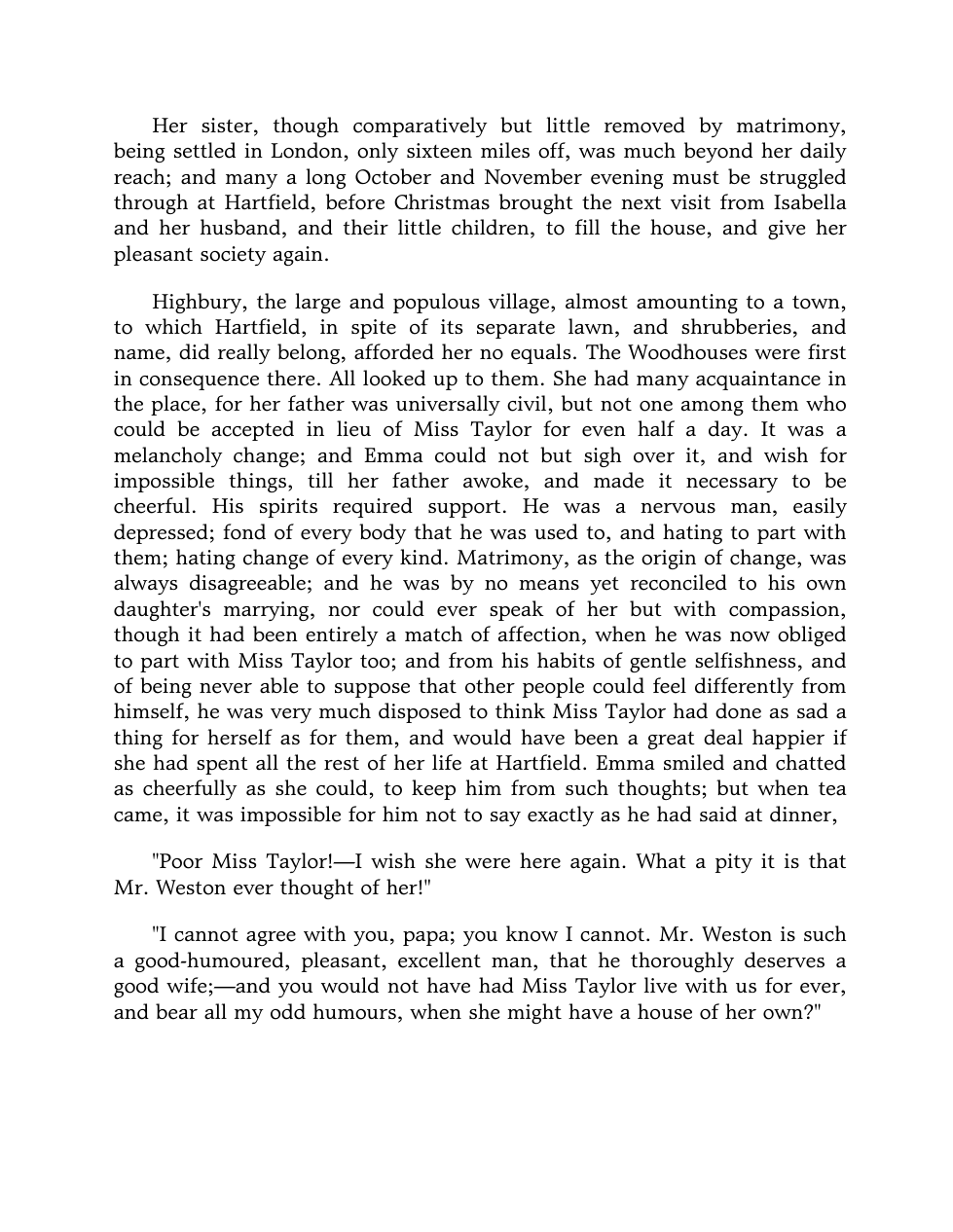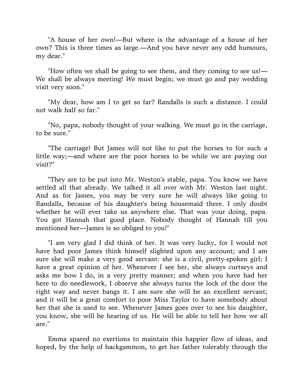 I cannot agree with you, papa; you know I cannot. Mr. Weston is such a good-humoured, pleasant, excellent man, that he thoroughly deserves a good wife; — and you would not have had Miss Taylor live with us for ever, and bear all my odd humours, when she might have a house of her own?
