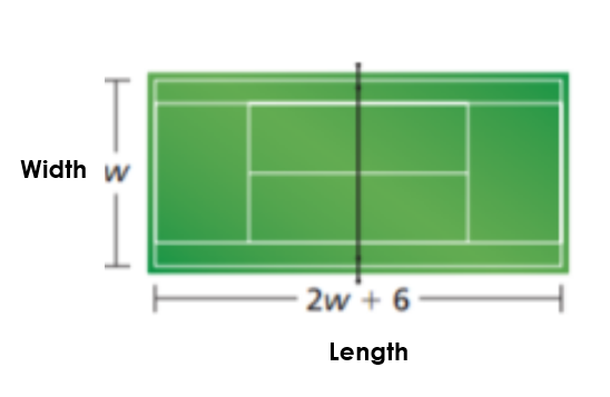 The perimeter of the court is 228 feet. What is the length and width of the court?