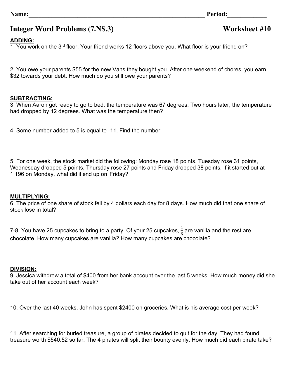 734LRIS WS#13 (Tan) Integer Word Problems