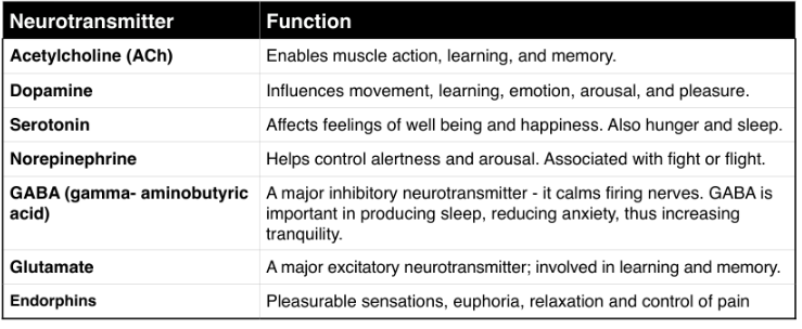 Using the chart of Neurotransmitters above (or your notes from yesterday), please match each statement in the left column with the correct neurotransmitter in the right column.