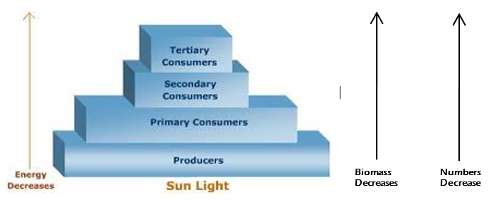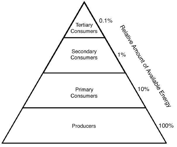 Explain how does the available energy at the producer level affect the population sizes of organisms at different trophic levels?