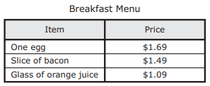 The table shows the prices of some breakfast items at a restaurant. Sara ordered 2 eggs, a slice of bacon, and a glass of orange juice for breakfast. The sales tax for the order was $0.48. She paid for her breakfast with a $10 bill.