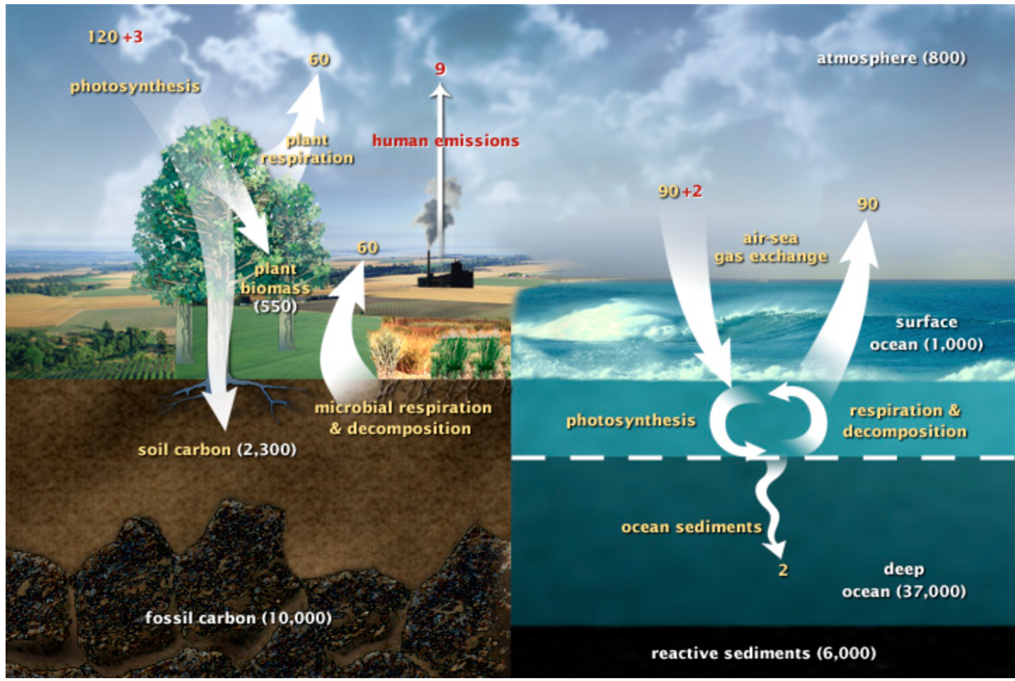 This diagram of the fast carbon cycle shows the movement of carbon between land, atmosphere, and oceans. Yellow numbers are natural fluxes, and red are human contributions in gigatons of carbon per year. White numbers indicate stored carbon. (Diagram adapted from U.S. DOE, Biological and Environmental Research Information System.)