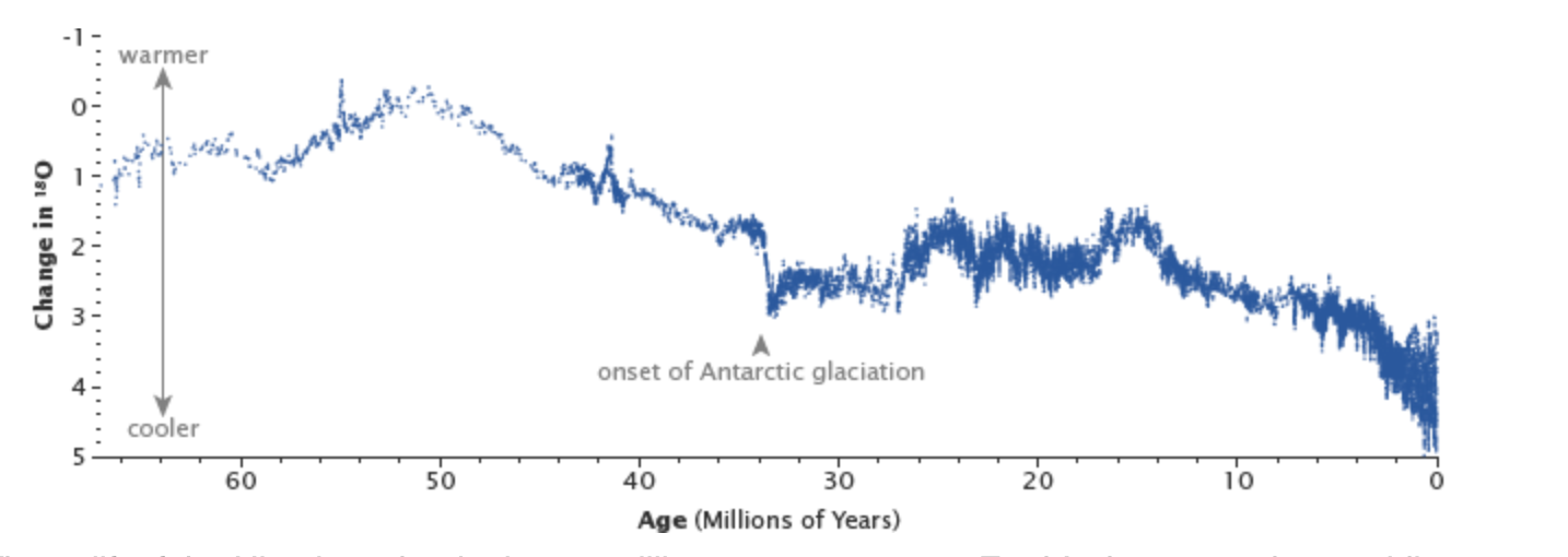The uplift of the Himalaya, beginning 50 million years ago, reset Earth’s thermostat by providing a large source of fresh rock to pull more carbon into the slow carbon cycle through chemical weathering. The resulting drop in temperatures and the formation of ice sheets changed the ratio between heavy and light oxygen in the deep ocean, as shown in this graph. (Graph based on data from Zachos at al., 2001.)