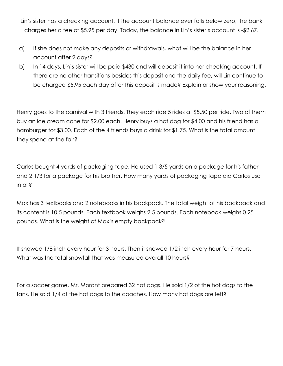 Lin’s sister has a checking account. If the account balance ever falls below zero, the bank charges her a fee of $5.95 per day. Today, the balance in Lin’s sister’s account is -$2.67.