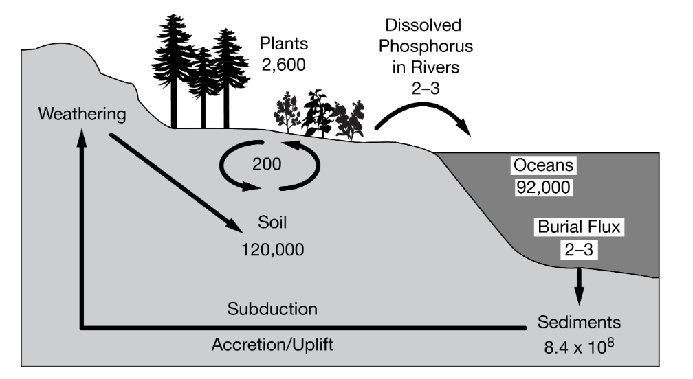 The diagram shows the amount of phosphorus measured in teragrams (1 teragram = 1×1012 grams), in the various reservoirs of the phosphorus cycle.