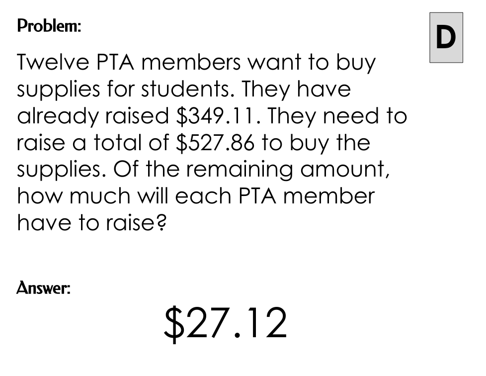 Of the remaining amount, how much will each PTA member have to raise? _______ (round to the nearest hundredths)