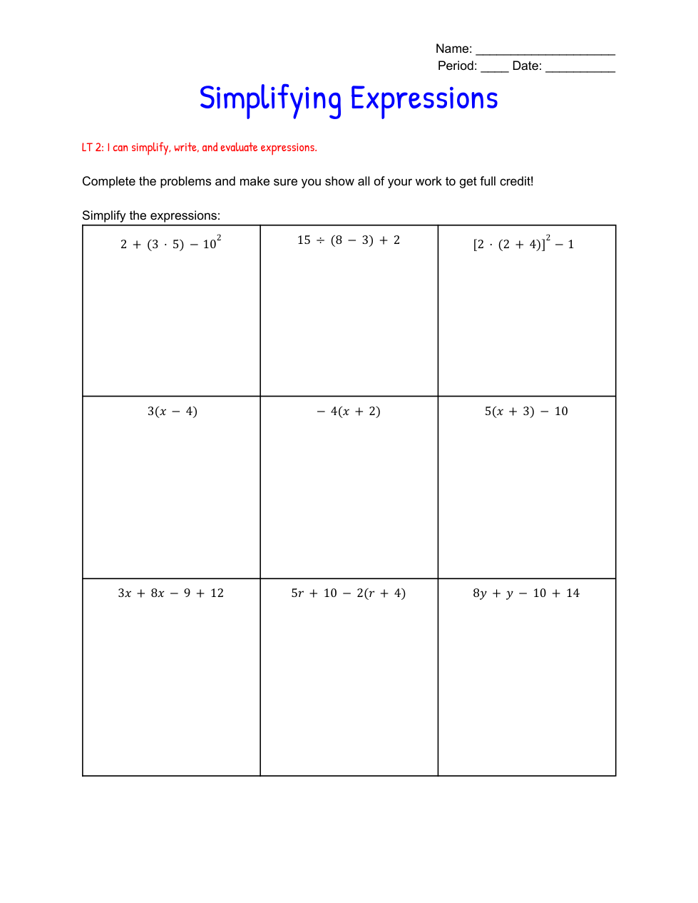 M1 - Simplifying Expressions Practice - Bartels