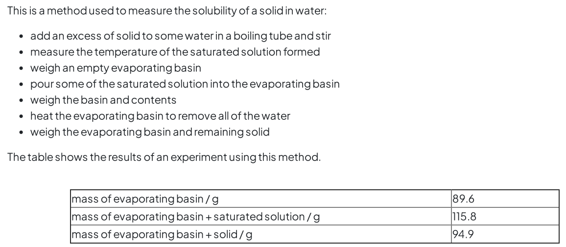 Use your graph to calculate the solubility of potassium nitrate in g per 100 g of water at25 °C. [1.0 cm of water has a mass of 1.0 g]