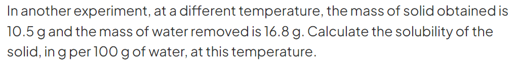 Calculate the mass of solid obtained and the mass of water removed.